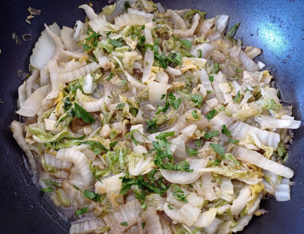 Coupez le chou en morceaux et le rincer. Pelez et émincez l’ail et les oignons. Pelez et râpez le morceau de gingembre le cas échéant. Chauffez l’huile dans un wok. Faites revenir les oignons, l’ail et le gingembre 2 min. Ajoutez le chou et faites revenir 5 min en mélangeant. Ajoutez la sauce soja et le sésame. Faites revenir le tout encore 2 min et servir.