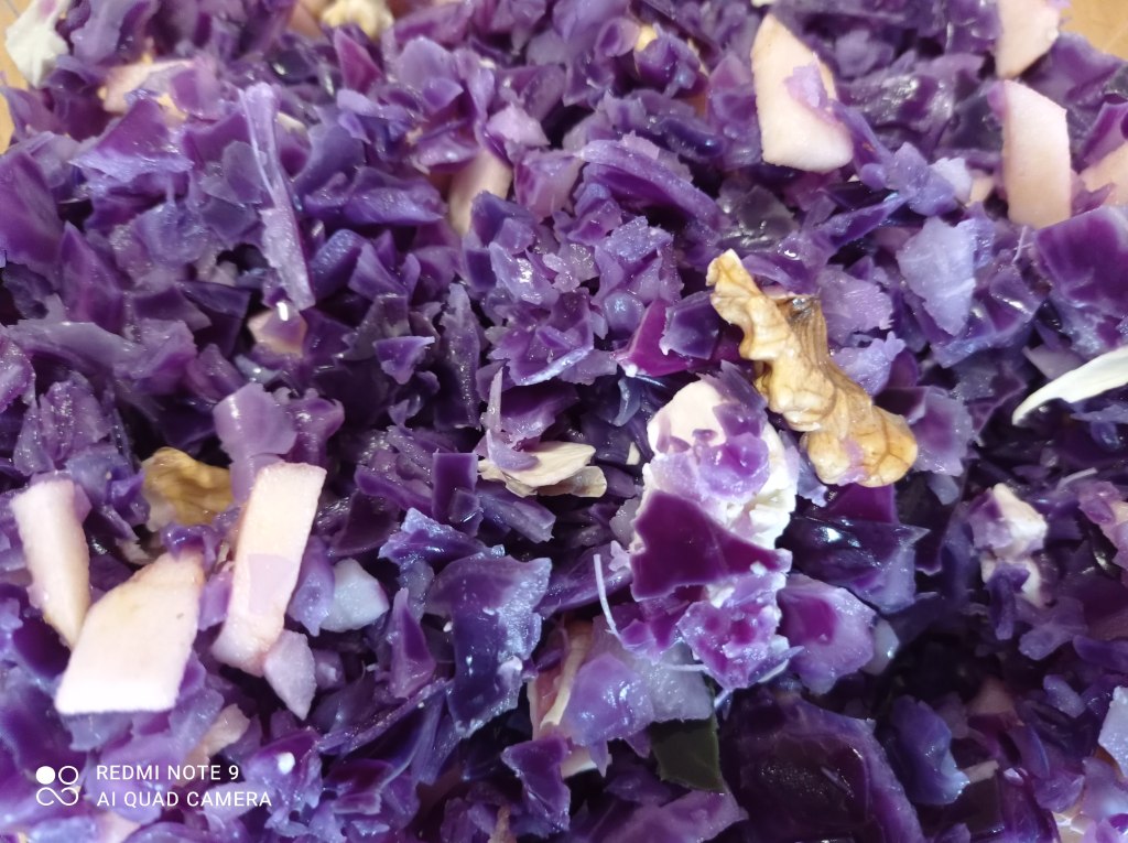 Mettre le chou dans un saladier. Ajouter le roquefort, la pomme et les noix. Ajouter la sauce vinaigrette, saler et poivrer.