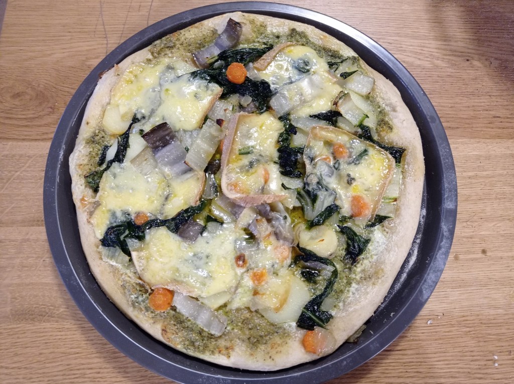 5/ Dresser la pizza : appliquer sur la pâte le mélange au pesto. Ajouter les pommes de terre, puis les légumes. Terminer par les tranches de morbier.