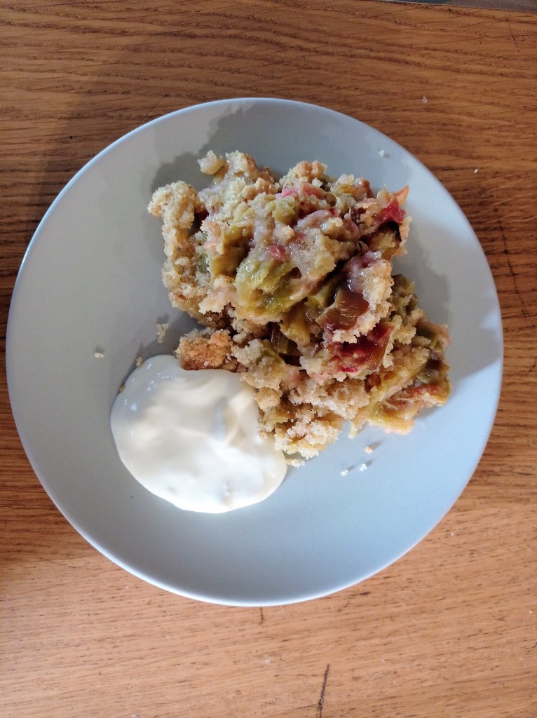 Couvrir la rhubarbe de la pâte à crumble et enfourner 20 min jusqu’à ce que la croûte soit dorée. Servir tiède. Pour encore plus de gourmandises, le crumble peut s’accompagner d’une boule de glace vanille ou d’une cuillère de crème fraîche comme sur la photo.