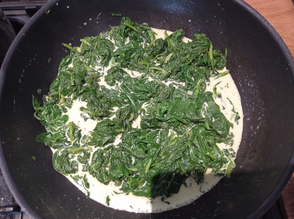 2/ Lorsque les épinards ont fondu (environ 5 min), ajouter la crème et les parfumer de muscade, de sel et de poivre.