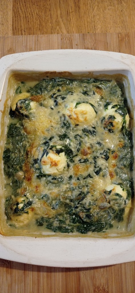 4/ Assemblage du gratin : Préchauffez le four à 180°. Ecalez les oeufs durs et disposez les dans un plat à gratin. Versez la préparation d’épinards/béchamel par dessus, puis, parsemez de fromage râpé. Enfournez pendant 15 à 20 min.