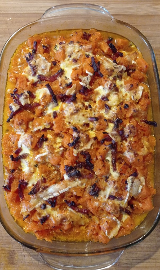 3/ Assembler le gratin : disposer la courge butternut dans un plat à gratin, ajouter les lardons puis verser la crème liquide. Déposer les morceaux de camembert sur le dessus. Assaisonner avec le sel, poivre et du thym (ou herbes de Provence).