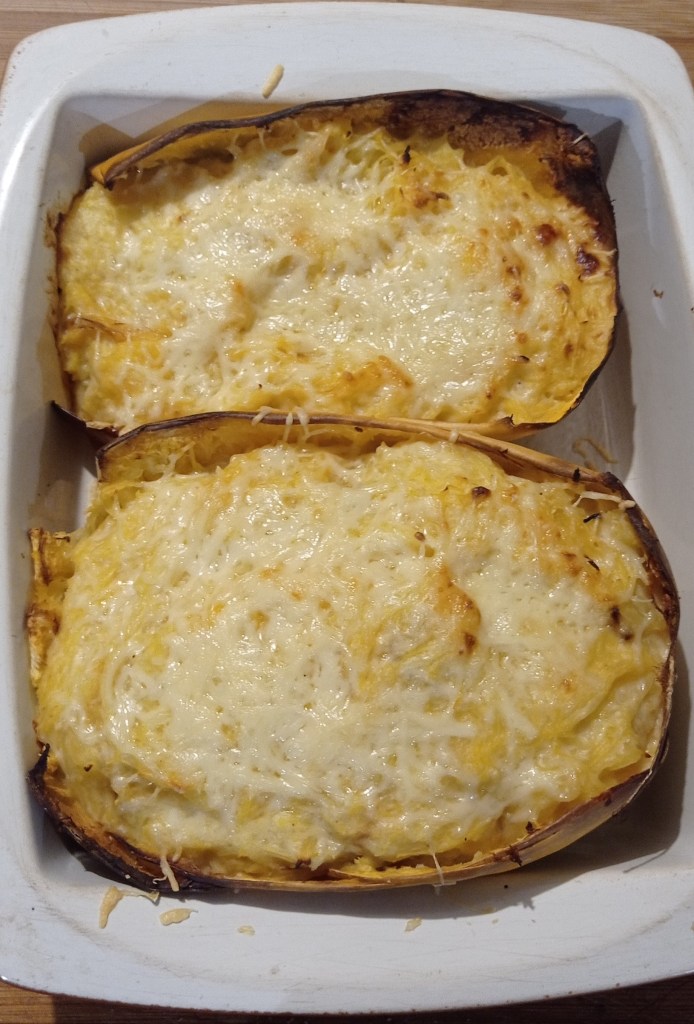 3/ Au bout de 45 min, retirer la courge de four. Laisser refroidir (10/15min). Ensuite, gratter la chair avec un cuillère ou une fourchette et la mettre dans un saladier. Mélanger la chair avec la sauce Mornay. Rectifier l’assaisonnement si besoin. Répartir cette préparation dans les demi-courges. Mettre la moitié du fromage dessus et laisser gratiner au four pendant 15-20 min. Bon appétit!