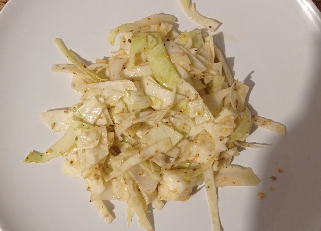 3/ Mélangez la sauce avec le chou. Ajoutez le poivre, le piment et les graines de sésame et mélangez à nouveau. Bon appétit! C’est délicieux voire un peu addictif!