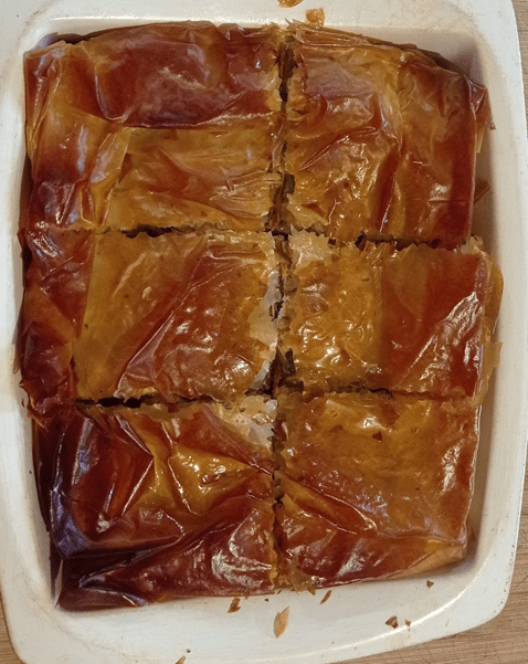 4/ Pour le montage, disposer une à une 3 feuilles de pâtes filo badigeonnées d’huile d’olive avec un pinceau. Verser le mélange aux épinards. Mettre 5 feuilles de pâtes filo huilées une à une. Replier les bords dans le plat. Enfourner dans un four préchauffé 30 min à 190°.